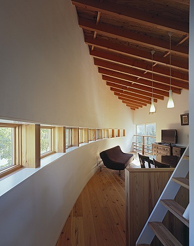 建蔽率30%、道路境界から2mそして隣地境界から1.5 mの壁面後退と緑地率30%。変形した小さな敷地(約49坪)では難しい課題であった。 敷地形体と同じプラン形体で傾斜地に埋め込むと、周辺の環境と対話が可能になる。 北東に開かれた角地面は1階のリビングダイニングの連窓から借景を望む。 隣家の迫った南面はベンチ沿いの窓から庭の緑とふれあう。 午前中の陽の恵みは南東角突端にある大きな窓から光をもらいアールの壁で奥に誘い込む。